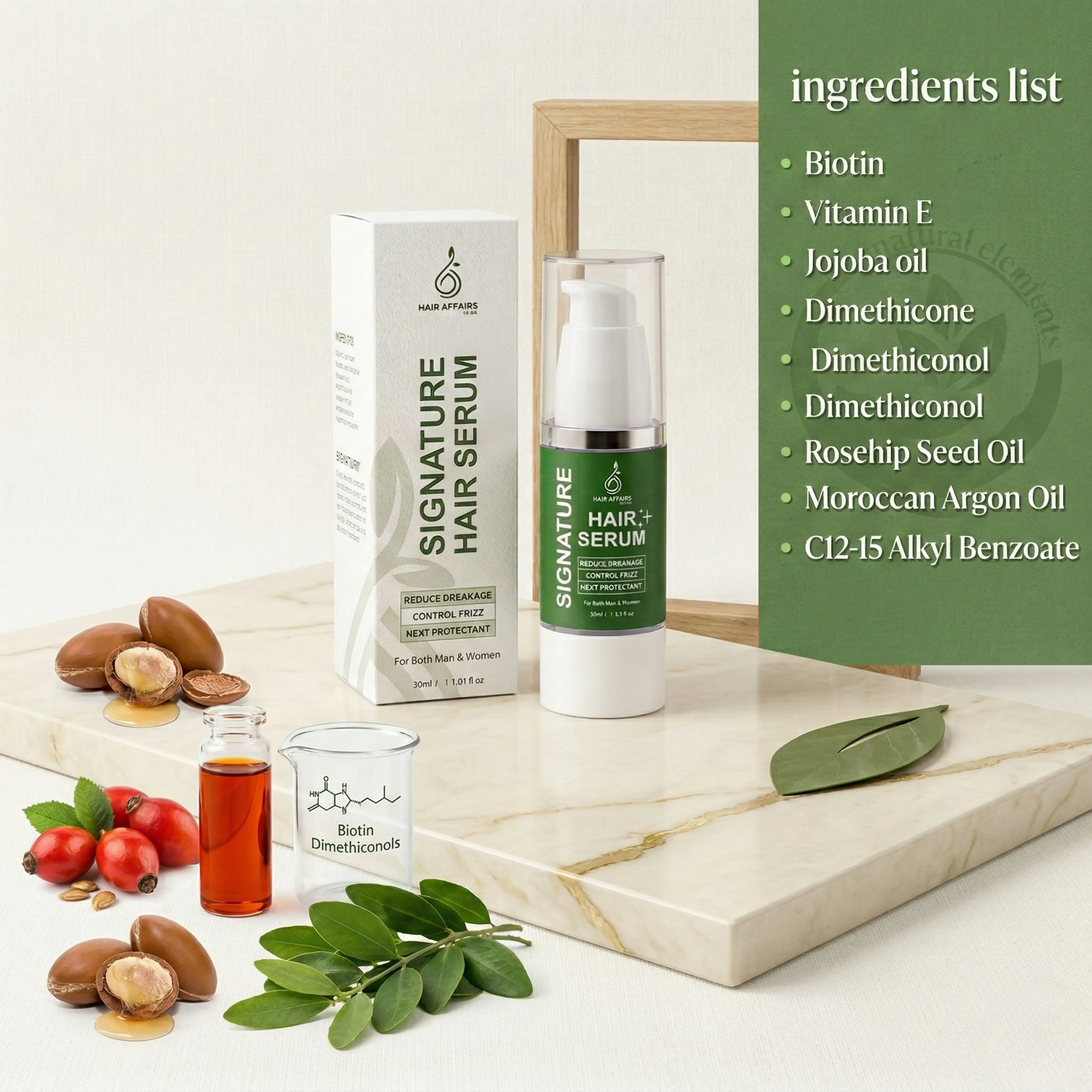 Signature Nature Hair Serum is a lightweight, professional-grade formula designed to reduce breakage, control frizz and protect hair from heat damage. Enriched with biotin, vitamin E, jojoba oil, rosehip oil and Moroccan argan oil, it delivers smooth, glossy, and healthy-looking hair.