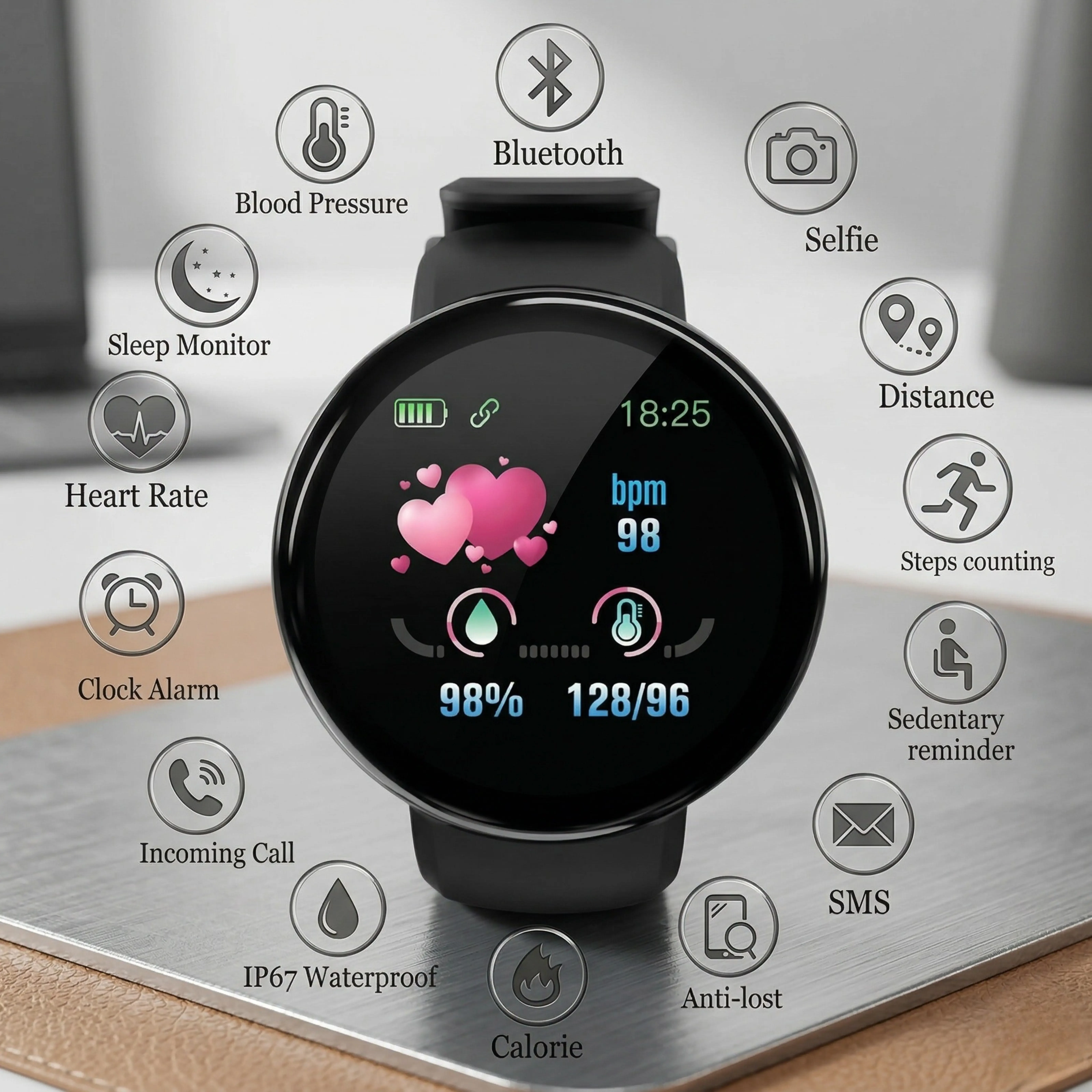 ⌚ Smart Watch – Your Daily Fitness & Lifestyle PartnerUpgrade your lifestyle with this advanced smart watch, designed to keep you connected, healthy, and active all day. Whether you're tracking fitness goals or managing daily tasks, this smartwatch is the perfect companion. 🔥 Key Features:✔ Heart Rate MonitoringTrack your heart health in real-time and stay informed. ✔ Sleep MonitoringAnalyze your sleep patterns for better rest and recovery. ✔ Bluetooth ConnectivityStay connected with notifications, calls and alerts. ✔ Fitness TrackingMonitor steps, distance, calories burned & activity levels. ✔ Waterproof Design (IP67)Safe for everyday use, even during workouts or rain. ✔ Multi-Function SupportAlarm, SMS alerts, sedentary reminder & more. 🎯 Why Customers Love It: